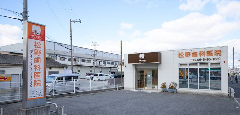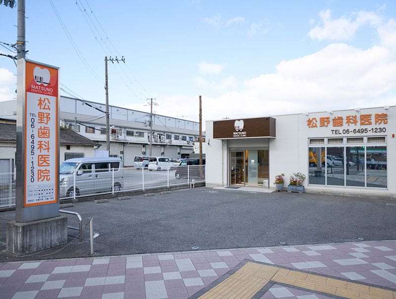 左手(交差点南西角)にコンビニ(ファミリーマート)が見えるので、その向かい(交差点北西)に松野歯科医院が見えます。