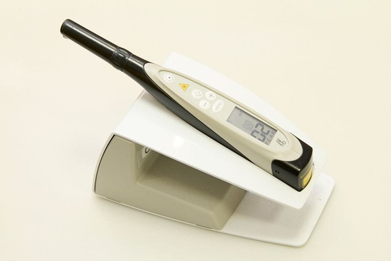 肉眼では、チェックできない溝の中、歯と歯の間を、「ダイアグノデント」というレーザーを用いた虫歯検査機器を用いてのチェックを行います。見つかった虫歯に関して治療が必要かどうかを数値で客観的に判定し、必要以上に歯を削らない治療に役立てています。放射線は使用していないため、被ばくの心配はありません。