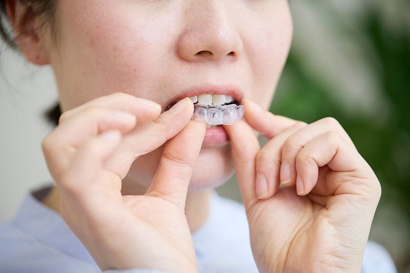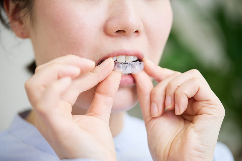 ホームホワイトニングは、専用のマウスピースに、薬剤を入れて1日最短30分程度ご自宅で装着いただく方法です。歯の内部にゆっくりと薬剤が浸透し、自然で透明感のある白さに仕上がります。